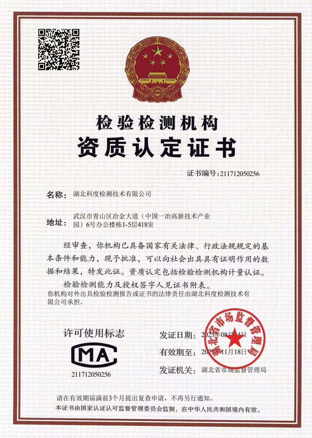 湖北科度檢測技術有限公司是一家專業(yè)從事環(huán)境類及相關領域檢測的第三方檢測機構,公司已通過湖北省市場監(jiān)督管理局CMA計量認證,可以面向社會出具權威CMA檢測報告。 我公司實驗室嚴格按照國家標準建設,擁有一大批國內外先進儀器設備及現(xiàn)代化配套設施,并有經(jīng)驗豐富的中高級專業(yè)技術人員和嚴格的實驗室質量保證體系為項目運作提供強力支撐。 作為第三方檢測機構,公司始終以高度的社會責任感經(jīng)營企業(yè),以“公正、嚴謹、高效”為宗旨,依托專業(yè)的技術實力為客戶提供專業(yè)優(yōu)質檢測服務,受到政府、企業(yè)和社會各界的廣泛關注和認可。